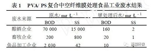 甘蔗糖廠的副產品———糖蜜生產酒精的企業(yè)排放的廢水中由焦糖色素產生的COD、BOD 及色度是生物法難以去除的。用MBR 與NF 膜集成工藝處理糖蜜制酒精廠排放廢水,出水的COD、色度都達到國家一級排放標準,廢水回收率> 80 % 。表1 列出了采用復合的中空纖維大孔(MF/ UF) 膜裝置(最大膜面積為由55 支元件組裝成的385 m2) 處理釀酒工業(yè)廢水的效果。該復合膜表面涂覆了具有強親水性和強抗蛋白質粘附性能的PVA ,因此該復合膜對于富含蛋白質的食品工業(yè)廢水有很好的去除效果。經該大孔復合膜處理后,廢水中的BOD、SS 的含量都遠低于廢水排放標準。