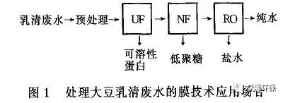 (1) UF/ (NF) RO 組合膜法。根據回收廢水的成分及回用水的要求,如圖1 所示 ,在合適的膜過程,可以回收到不同的高價值產品,如可溶性蛋白、低聚糖和純水。由于乳清蛋白分子量為2 000~20 000u、大豆低聚糖分子量為300~700 u ,因此采用UF 膜和NF 膜技術,可以將這2 種物質分離。研究表明,用UF 膜可回收乳清廢水中幾乎所有的蛋白質; 用NF 膜濃縮UF 透過液,對大豆低聚糖中功能性成分水蘇糖和棉子糖的回收率超過90 %。UF 濃縮液經雙效蒸發(fā)濃縮和噴霧干燥即可得到成品乳清蛋白粉。大豆乳清廢水經過粗過濾、脫色除鹽后,用PS的UF膜去除廢水中的雜蛋白,再用NF 或RO 濃縮提取低聚糖 。結果表明,UF 有效地脫除了乳清廢水中的蛋白;選用的NF 膜和RO 膜都能把乳清液中的低聚糖100 %回收,低聚糖的濃度從起始的1 %提高到12 %。