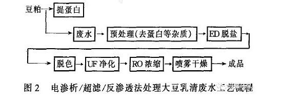 (2) ED/ UF/ RO 組合膜法。大豆加工廢水先用板框過濾機初濾,濾液泵入UF 膜裝置,脫除蛋白等雜質后,得到干物質約3 %濃度的濃縮液,然后泵入RO 膜裝置濃縮成含干物質約15 %的濃糖漿,再經ED 脫鹽、減壓濃縮成含干物質約50 %的漿狀低聚糖產品,最后經噴霧干燥得到低聚糖粉 。為了減少乳清廢水中無機鹽對NF 特別是RO過程的影響,經預處理的乳清廢水先進行ED 法除鹽,然后UF 法提取可溶性蛋白,RO 法濃縮低聚糖,工藝流程見圖2 。