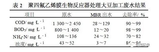 采用聚四氟乙烯( PTFE) 膜組裝成一體化MBR處理大豆加工廢水,結果見表2 。MBR 對COD、BOD的去除率均在90 %以上,效果顯著。