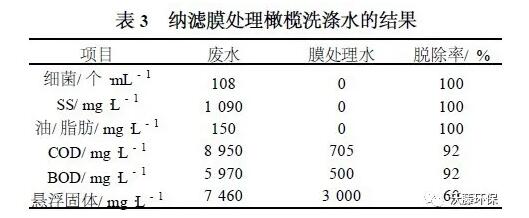 結構的NF 膜元件,在高的料液流量和錯流流速下運行,處理結果見表3 。膜技術代替?zhèn)鹘y(tǒng)的沉降池處理方法能高效回收浸泡橄欖后的鹽水 。