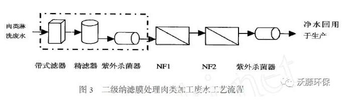 香腸淋洗水的廢水通過50μm 過濾→3μm 過濾→UV 殺菌→二級NF 膜處理后,一級和二級NF 對前三項污染物的脫除率( %) 分別為9516 、5511 ,9012 、9111 ,6017 、6518 ,水質接近于飲用水指標,可以回用到生產 。