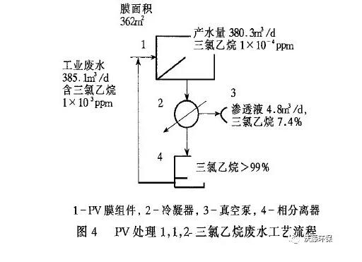 正如前述,處理食品工業(yè)廢水中的微量有機物,例如醇、酸、酯、酚和氯化烴等,用生物法因其濃度較高和不穩(wěn)定性,難以分解完全;用吸附、蒸餾、萃取等方法費用昂貴。1980 年后期,美國MTR 公司開發(fā)了硅橡膠為活性層的PV 復合膜卷式組件和Per Vap系統(tǒng)裝置,建立了PV 法處理三氯乙烷工業(yè)廢水的示范工程,其工藝流程見圖4 。